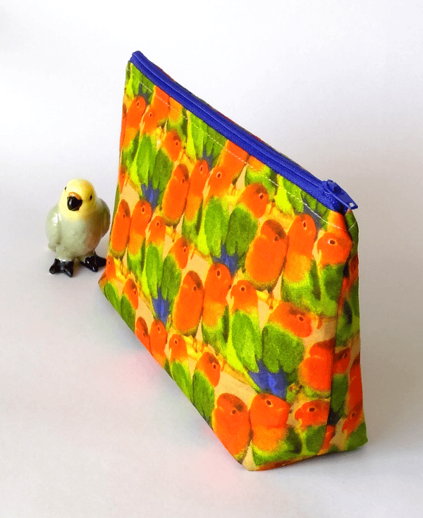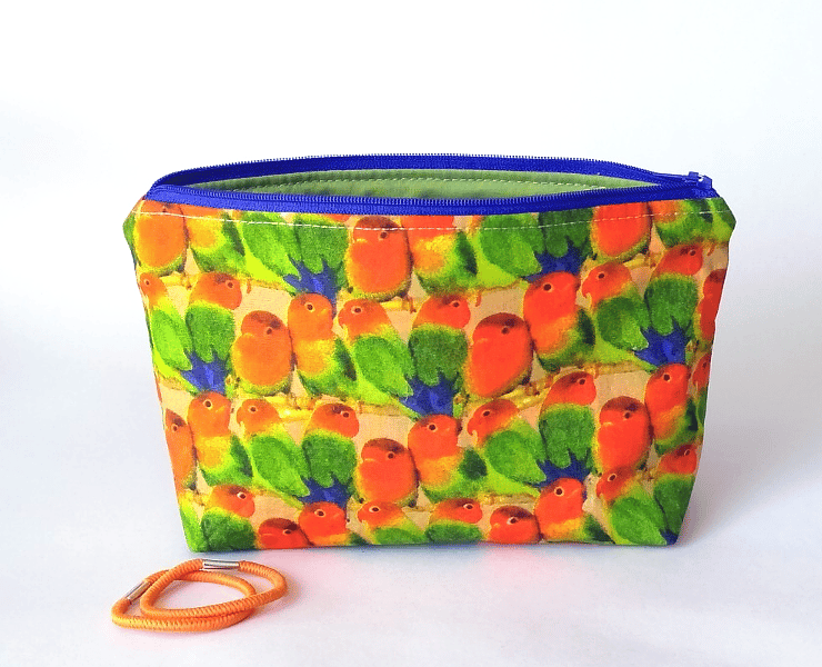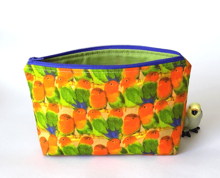 This is a pretty, zipped pouch, made with a beautiful cotton fabric with colourful lovebirds / parakeets on. The birds are all in a row and in typical lovebirds’ position – cuddled up against each other. I am no expert on lovebird mutations but I think these may be Fischer Lovebirds, with a green back and chest, orange and yellow head, and lovely blue rump feathers. This would be a lovely gift for a bird lover or pet bird lover.