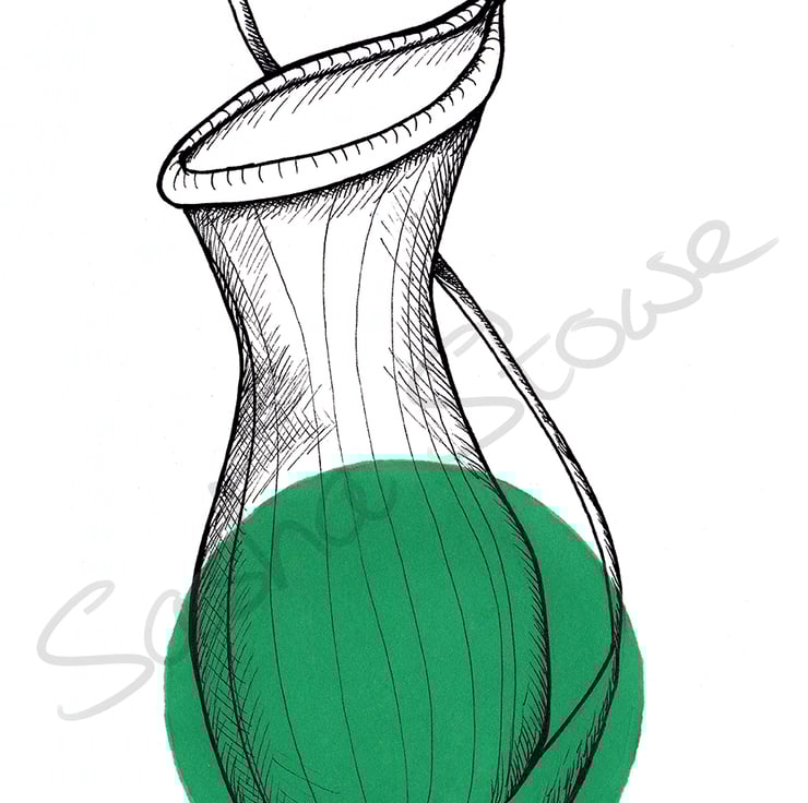 A beautiful minimalist Giclee print of a green carnivorous pitcher plant. The design and illustration was done by me and was inspired by Huevember 2018 when I matched up the day's colour with a flower/plant. Original image was created with ink pen and either Copic or Promarkers.