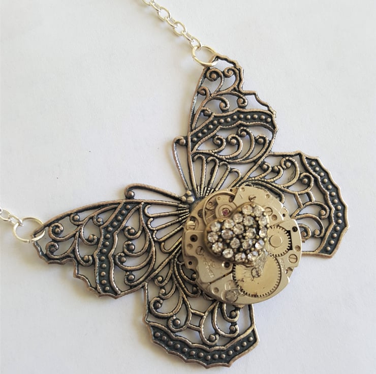 I have created this Steampunk necklace by placing a vintage watch movement, with all of the wheels and cogs on show, onto a filigree antiqued silver tone butterfly stamping. I have adorned the watch movement with a crystal heart rescued from a vintage piece of jewellery. I love the union of the mechnical and feminine.