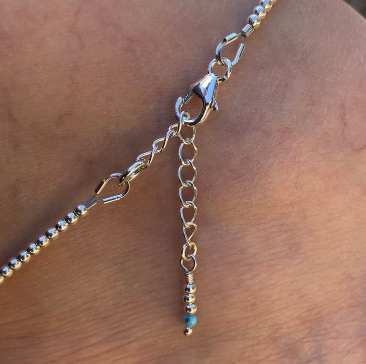 Handmade using 2mm sterling silver beads and 2mm faceted turquoise beads. Hand stung on strong jewellery wire and fastened with a lobster clasp.