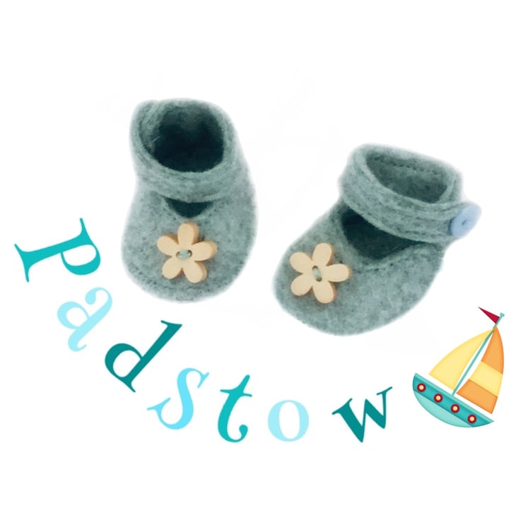 A cute little handcrafted pair of duck egg blue felt shoes, to fit the Mulberry Green characters. The shoes are made from best quality wool felt and are decorated with little wooden flower flowers. They fasten with a popper underneath a little button. They match the other Padstow items.