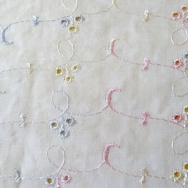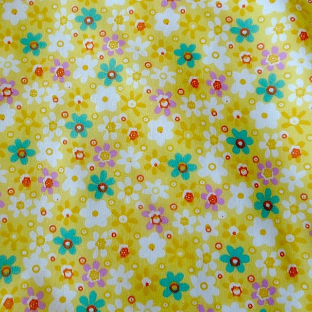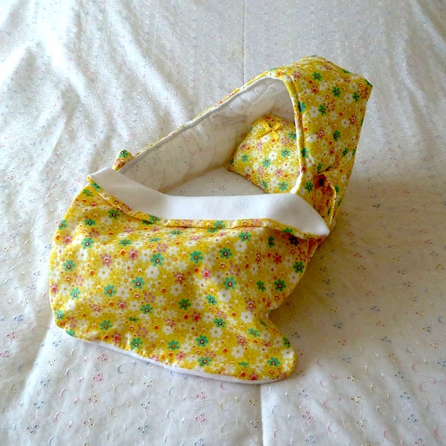 This pretty doll's carrycot is made from polyester cotton which has yellow backround with a turquoise , violet and white daisies design.