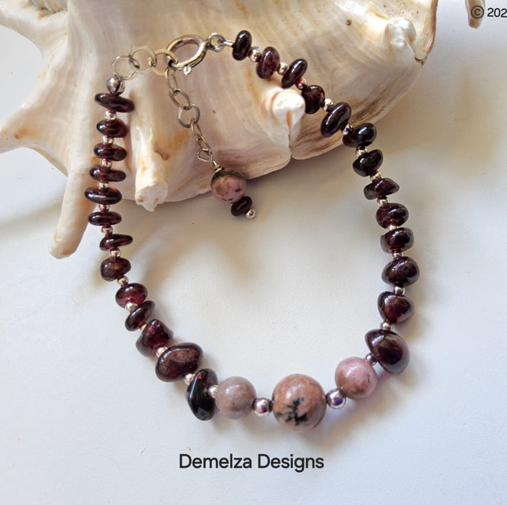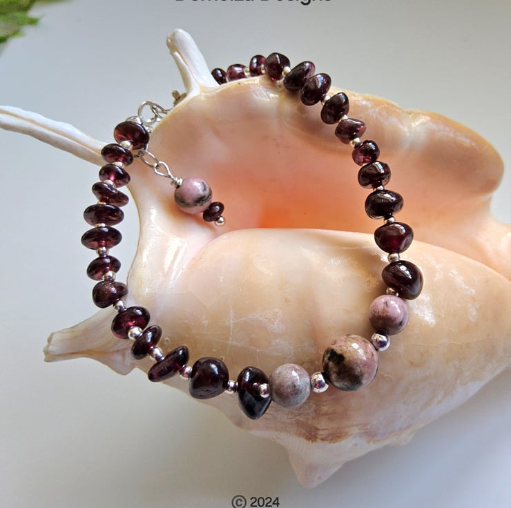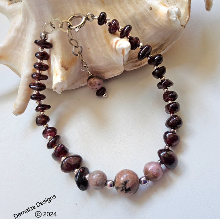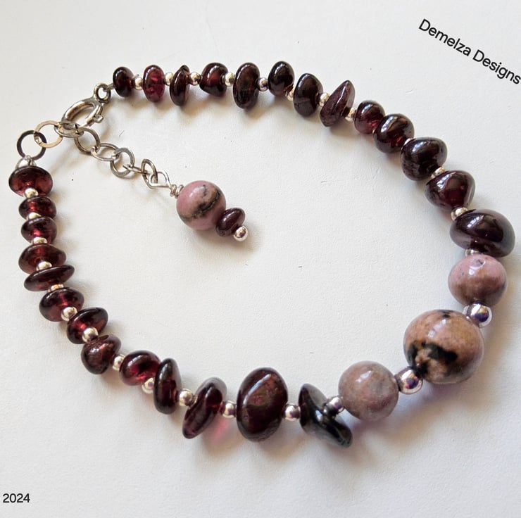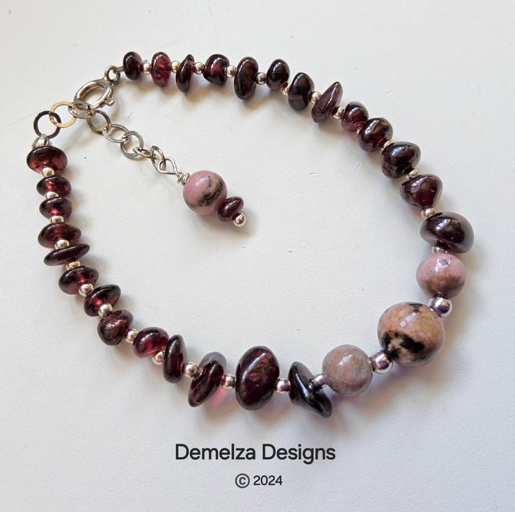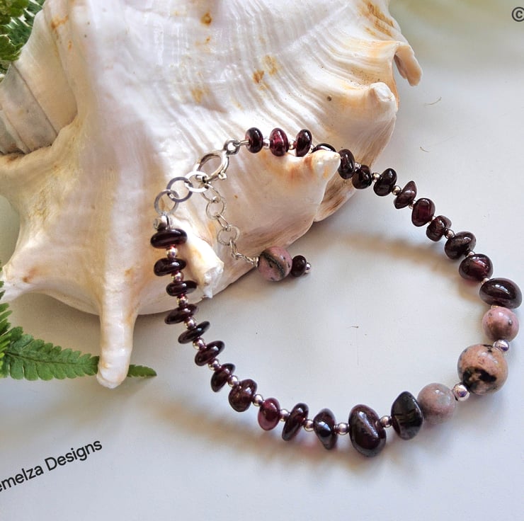A sweet bracelet ideal for everyday wear throughout the year for ladies of all age groups. It has been designed and hand crafted in Cornwall by Demelza Designs using pebble tumbled genuine deep ruby Indian red Garnet and rare Rhodonite round gemstones, complimented with 925 sterling silver beads. For the main construction professional stainless steel jewellers wire has been used for added strength and lasting durability, finshed of with a 925 sterling silver bolt ring clasp and extender chain.