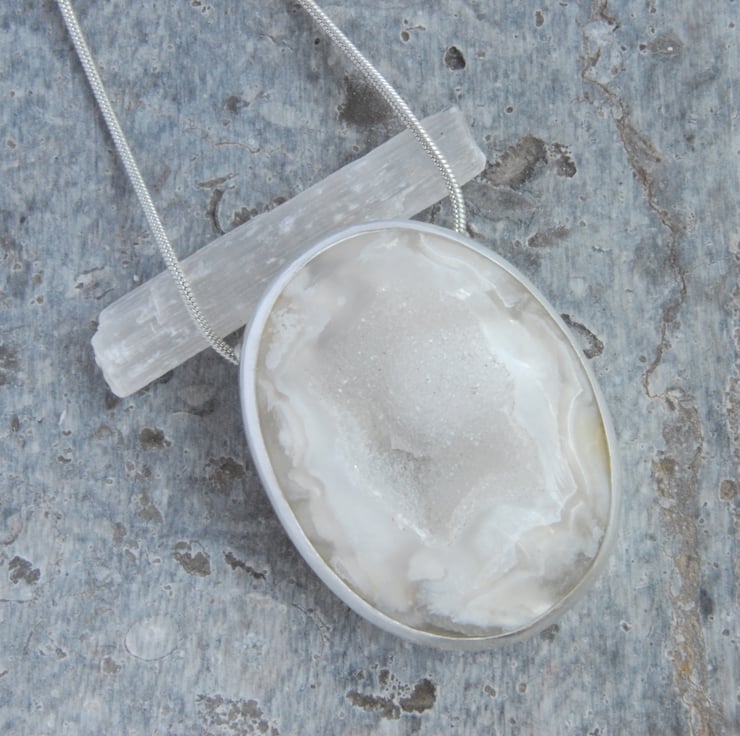 This eye catching statement pendant features a large cabochon of cloudy quartz with a sparkly pocket of druzy at its heart. Druzy is where the crystal points are on the surface (like a mini geode) so they catch the light and twinkle as the piece moves. The cloudy quartz has clear patches with creamy white bands and plumes in it and is the last of the druzy cabochons I bought whilst in Indonesia. This is a chunky pendant and has a pair of generous loops (6mm by 4mm) at the back of the setting (they are part way down the setting rather than at the very top), it comes with a sterling silver chain or you could slide it onto a ribbon or neckwire if you wanted to. Could be worn at any time but I think it would suit a vintage bride.