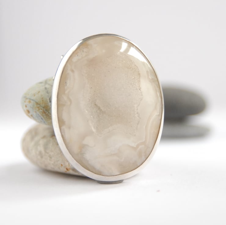 This eye catching statement pendant features a large cabochon of cloudy quartz with a sparkly pocket of druzy at its heart. Druzy is where the crystal points are on the surface (like a mini geode) so they catch the light and twinkle as the piece moves. The cloudy quartz has clear patches with creamy white bands and plumes in it and is the last of the druzy cabochons I bought whilst in Indonesia. This is a chunky pendant and has a pair of generous loops (6mm by 4mm) at the back of the setting (they are part way down the setting rather than at the very top), it comes with a sterling silver chain or you could slide it onto a ribbon or neckwire if you wanted to. Could be worn at any time but I think it would suit a vintage bride.
