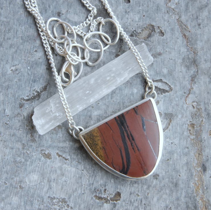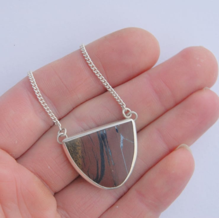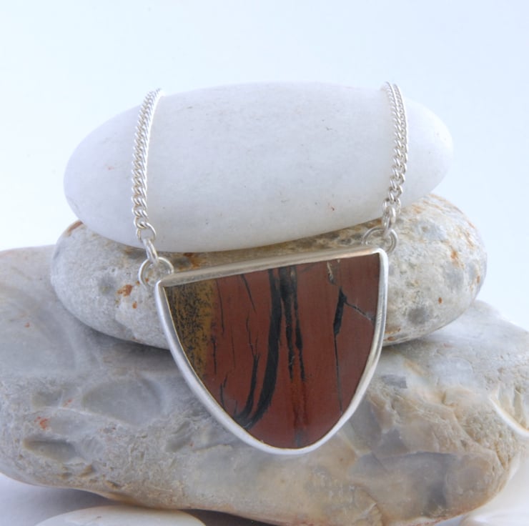 This minimalist necklace features an unusual rounded triangle of Indian Paint Stone which has been smoothly bezel set in sterling silver and hangs within a sterling silver curb chain complete with an extender. The Indian paint stone has a matte background in brick red with hints of mustard but features veining in shiny metallic black where water seeped into the stone and deposited the minerals it contained. Indian paint stone comes from Death Valley in the US however collecting the rough rock is no longer permitted and it is becoming hard to get, I'm sure anyone from Nevada/ California would love this necklace as a memento of home.