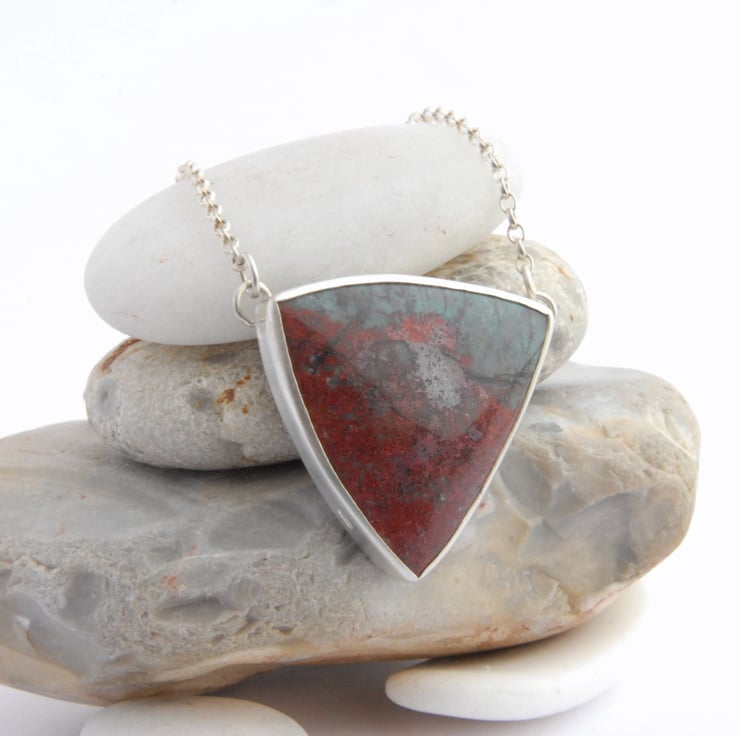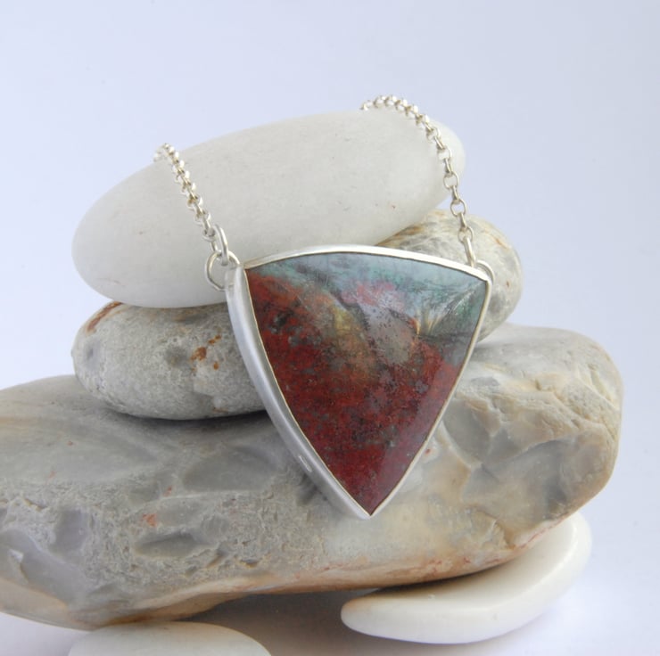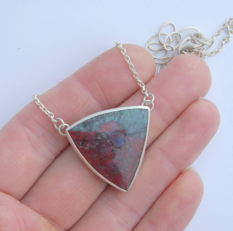 This modern minimalist necklace features a triangular cabochon of Sonoran sunset chrysocolla which has been bezel set in sterling silver and suspended within a sterling silver chain. Sonoran sunrise chrysocolla is a mix of green chrysocolla and rusty red cuprite, it is also sometimes known as Sonoran sunset chrysocolla and the mix of minerals is supposed to look like the red sunset sky over the green landscape of Sonora, Mexico but in this piece the red is at the bottom of the triangle and the minty green creeps into the top corners. Unusual and very pretty.