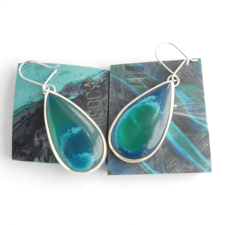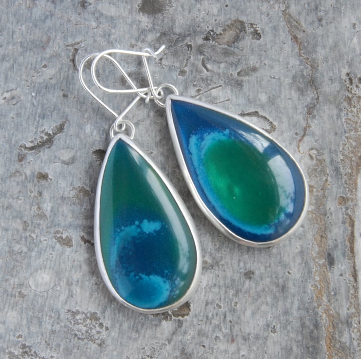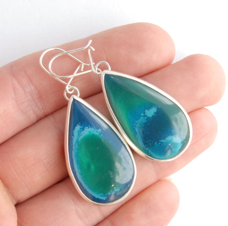 These eye catching earrings feature large drops of sparkly blue green bowlerite which has been smoothly bezel set in sterling silver. The earrings have been finished with sterling silver safety hooks (also known as kidney wires) to hold them securely in your ears. These statement earrings have a mismatched pair of drops one is sparkly azure blue with emerald and turquoise details whilst the other is sparkly emerald green with turquoise and azure blue details, the arcs of turquoise remind me of breaking waves. They are a larger size with a drop of 46mm from top to bottom and 19mm across but they are light weight.