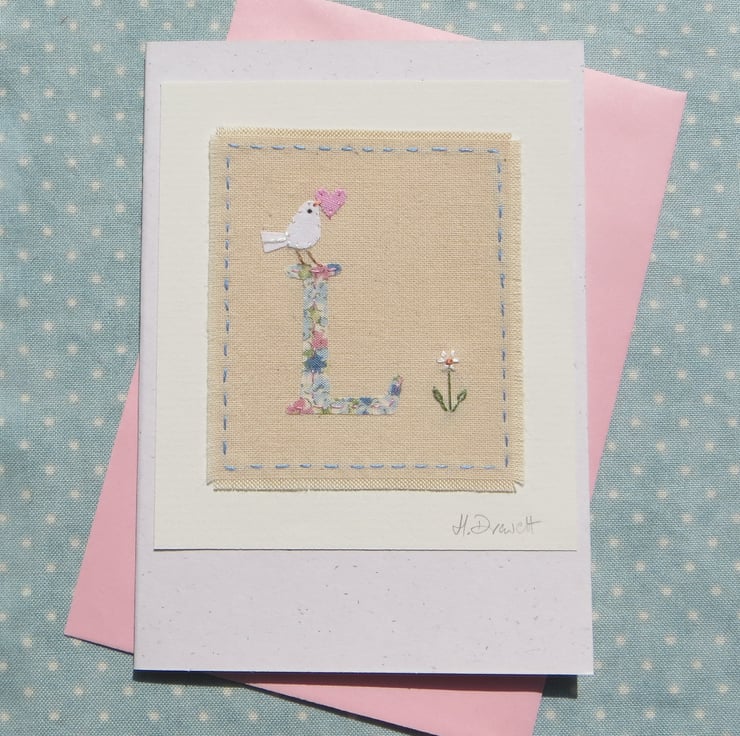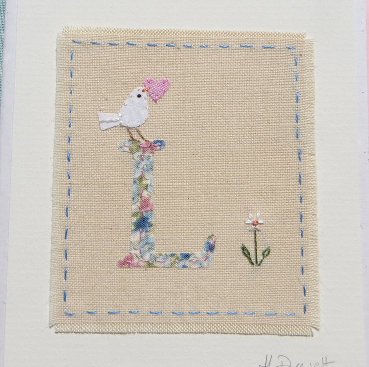 A small hand-stitched textile mounted onto a card with the letter 'L' cut from pretty floral fabric stitched into place with tiny stitches. I have added a miniature applique dove with heart in her beak, and then embroidered a tiny daisy flower to complete the design.