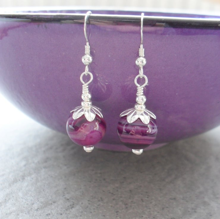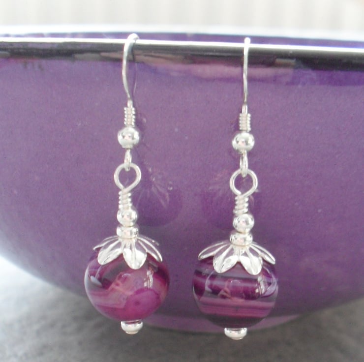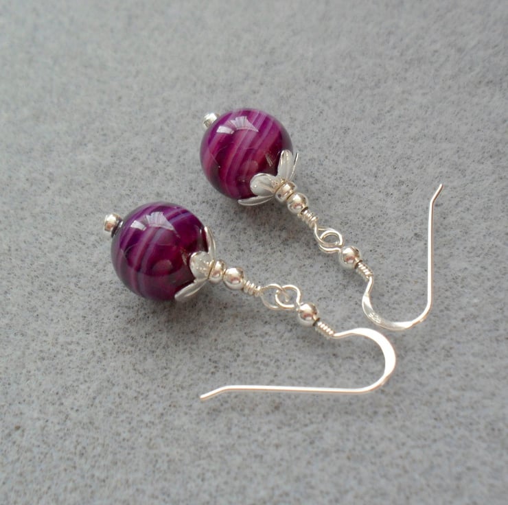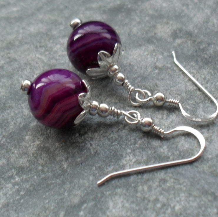 Dyed purple striped agate semi precious gemstones with sterling silver beads are attached to sterling silver ear wires