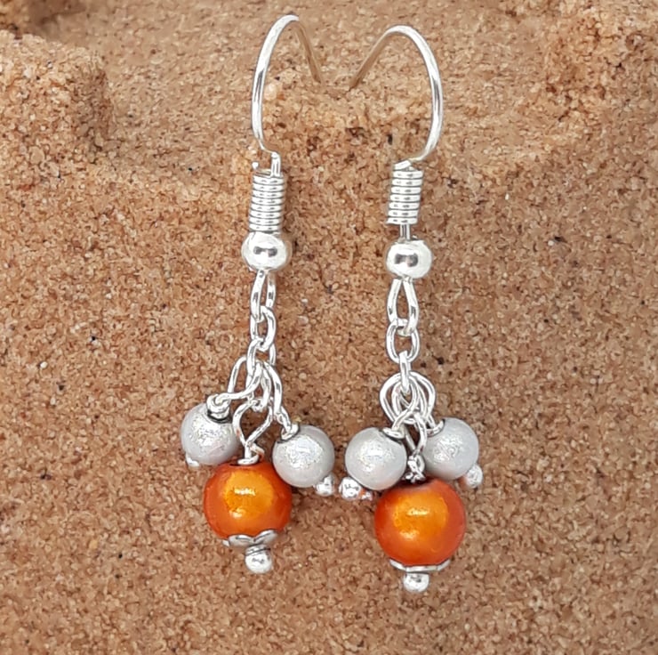 These shimmering drops are made using 4mm and 6mm orange and silver miracle beads with silver colour fittings and come in a pretty organza bag.