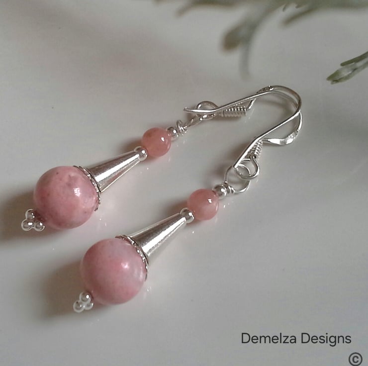 A lovely pair of earrings designed an hand crafted in Cornwall using exceptional quality genuine rhodochrosite gemstone rounds. Rhodochrosite is valued on it's colour. The more heavy black marinings within a gemstone the less valuable it is and readily available. The gemstones used for these earrings are a strong even pink colour and very feminine for daily wear. All components to create them are 925 sterling silver.
