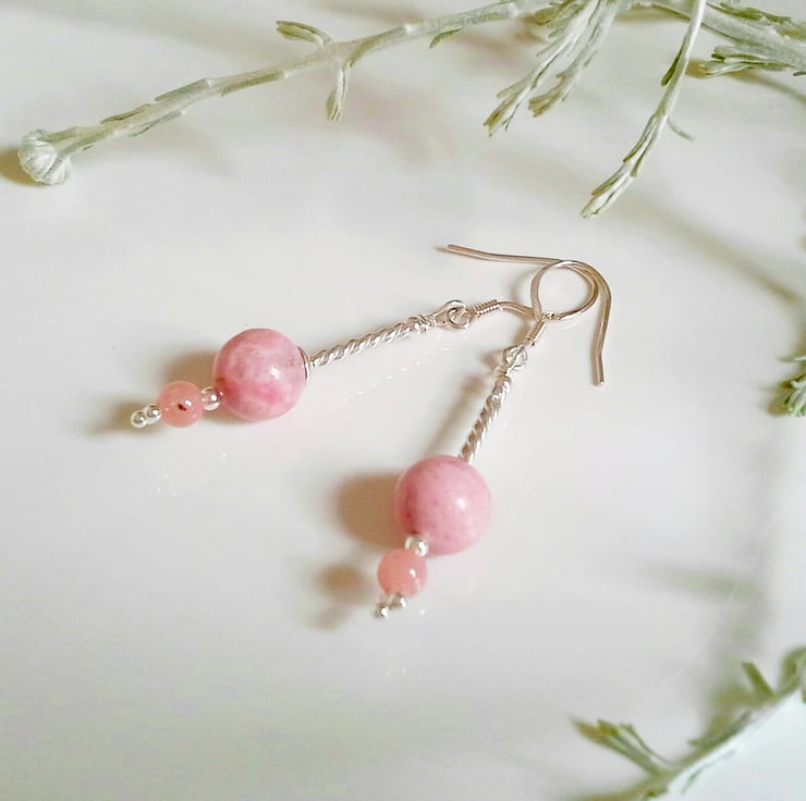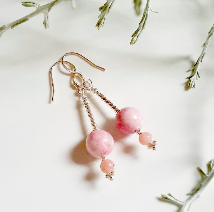 A sweet feminine pair of earrings designed and hand crafted in Cornwall using exceptional quality pink rhodochrosite round gemstones. Rhodochrosite is valued on it's colour. The more black markings a gemstone has the less valuable it is, and readily available. The gemstones within these earrings have a lovely pink even colour with little or no black marks. All components used are 925 sterling silver.
