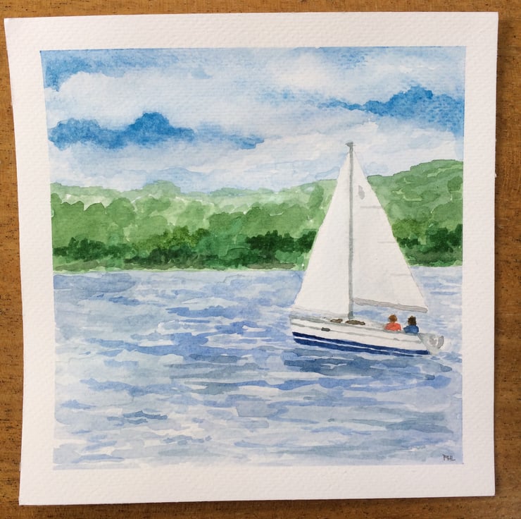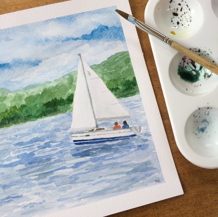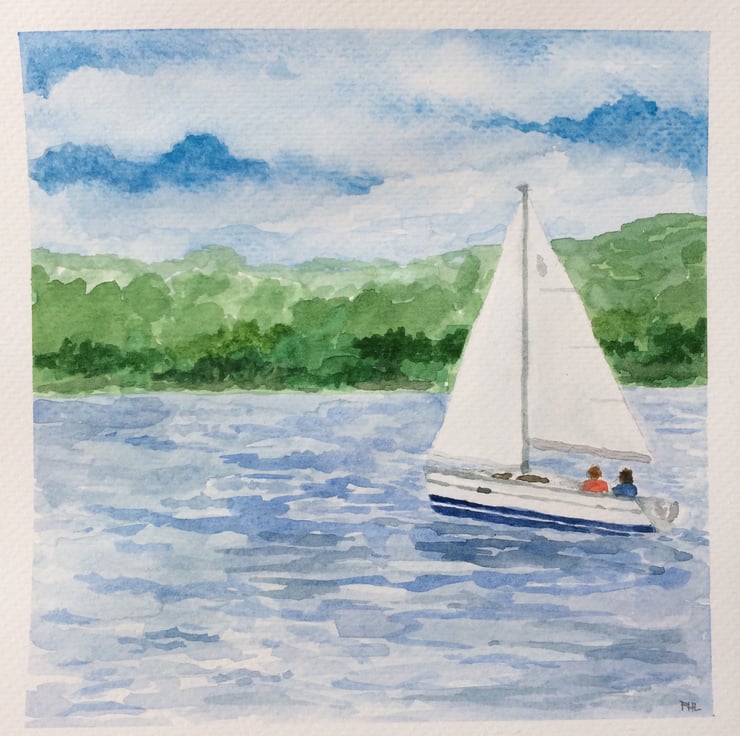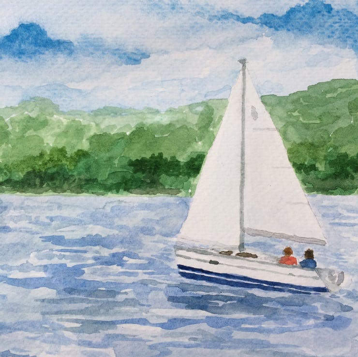 An original watercolour painting of a day out on the open water sailing on Lake Windermere.