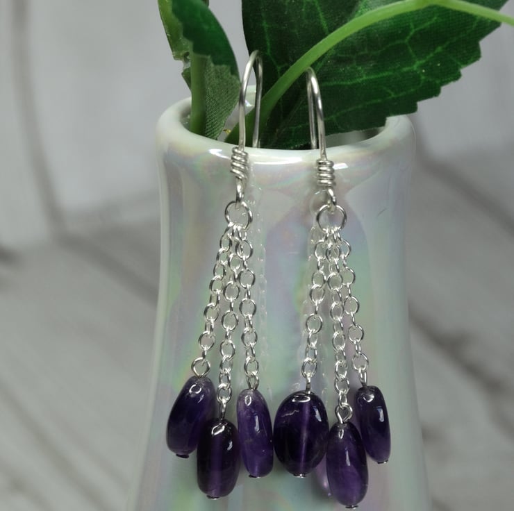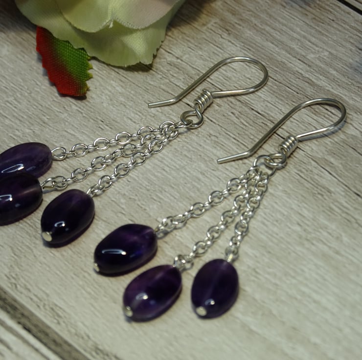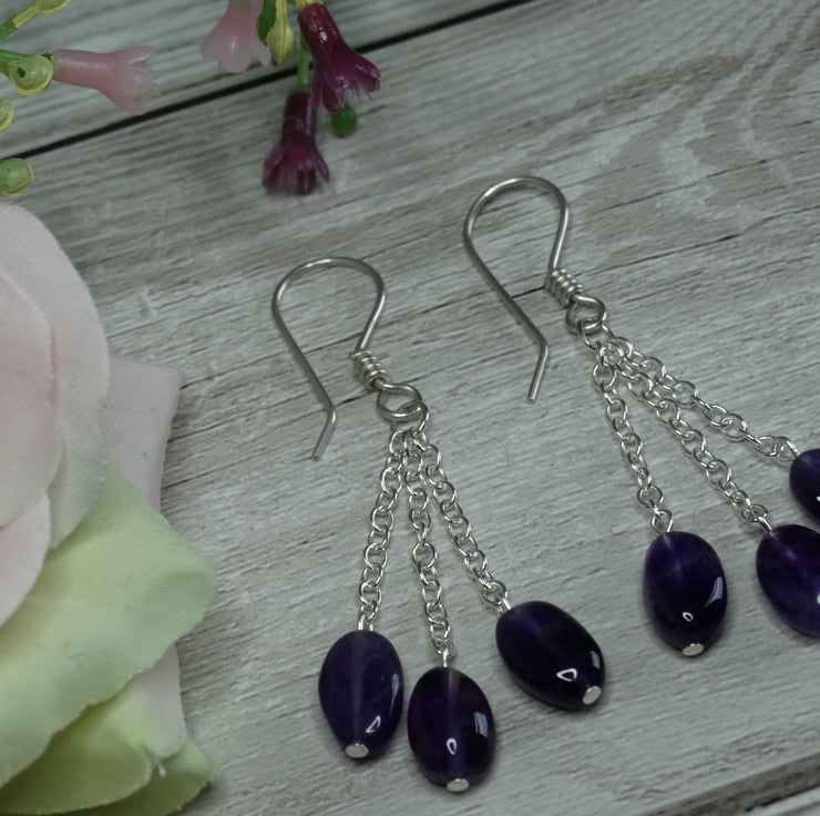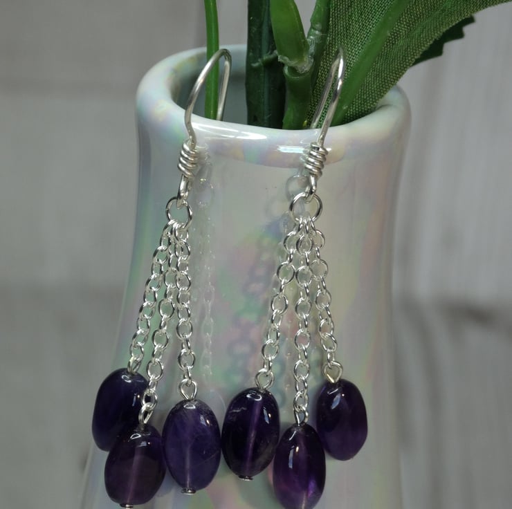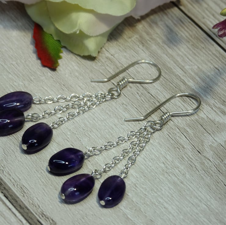 There are three chain lengths on each earring, the central one being approximately 2 mm longer than the outer two. A small amethyst flat oval bead hangs from the end of each chain.