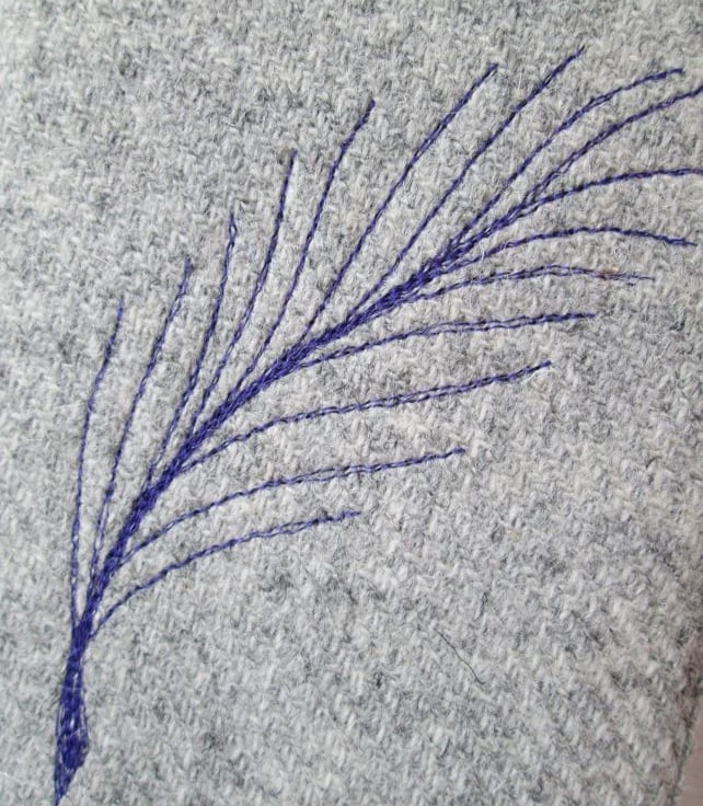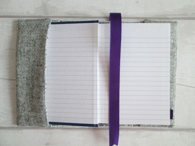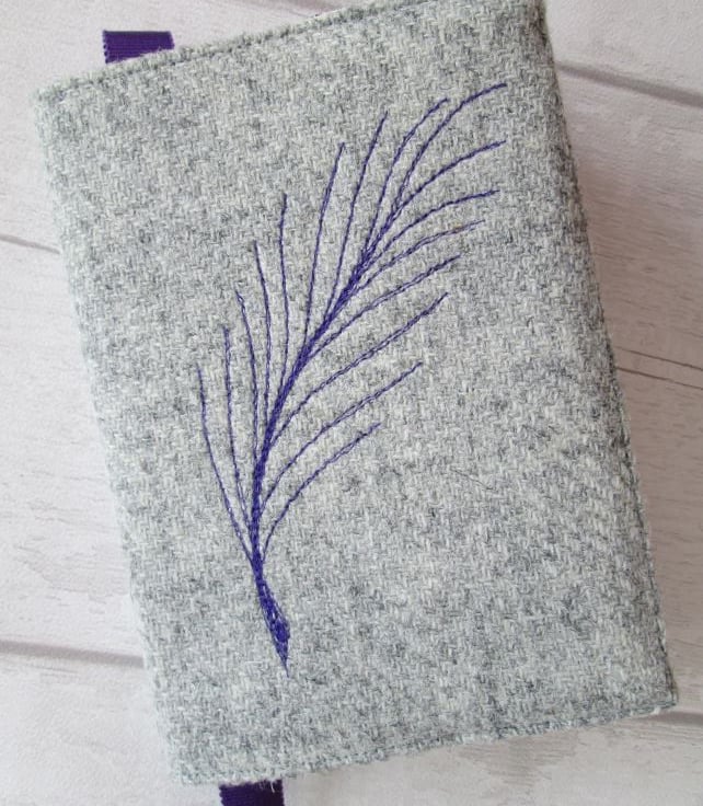 To continue the writing theme I've used freestyle machine embroidery to create a delicate, purple feather quill on the front and incorporated a purple ribbon place marker so you'll always know just where you left off writing.