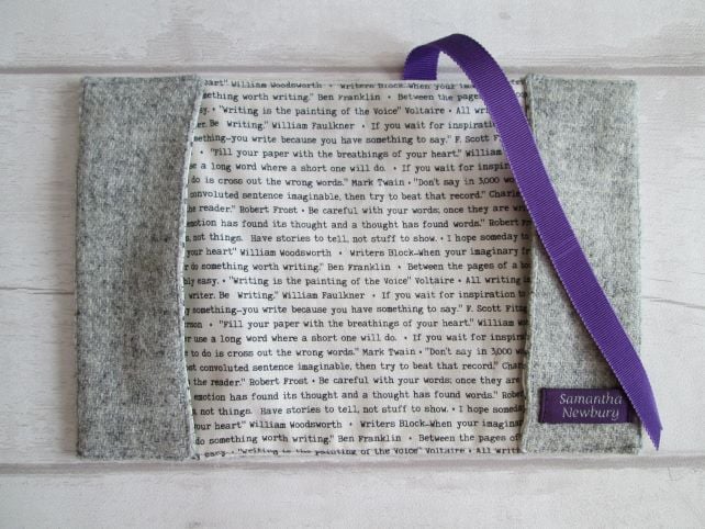I decided this particular piece would make a lovely cover for a writer's notebook, so the lining is cream cotton printed with inspirational and thought provoking quotes about writing from famous authors including Wordsworth, Twain and Voltaire.