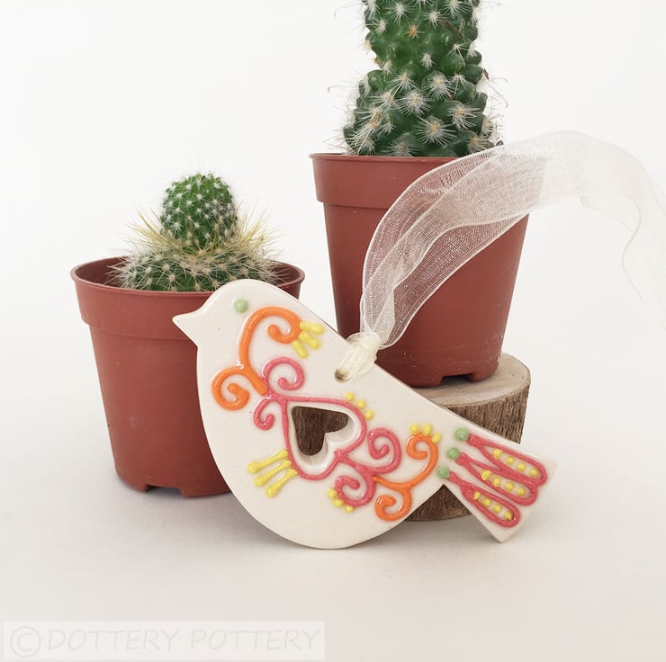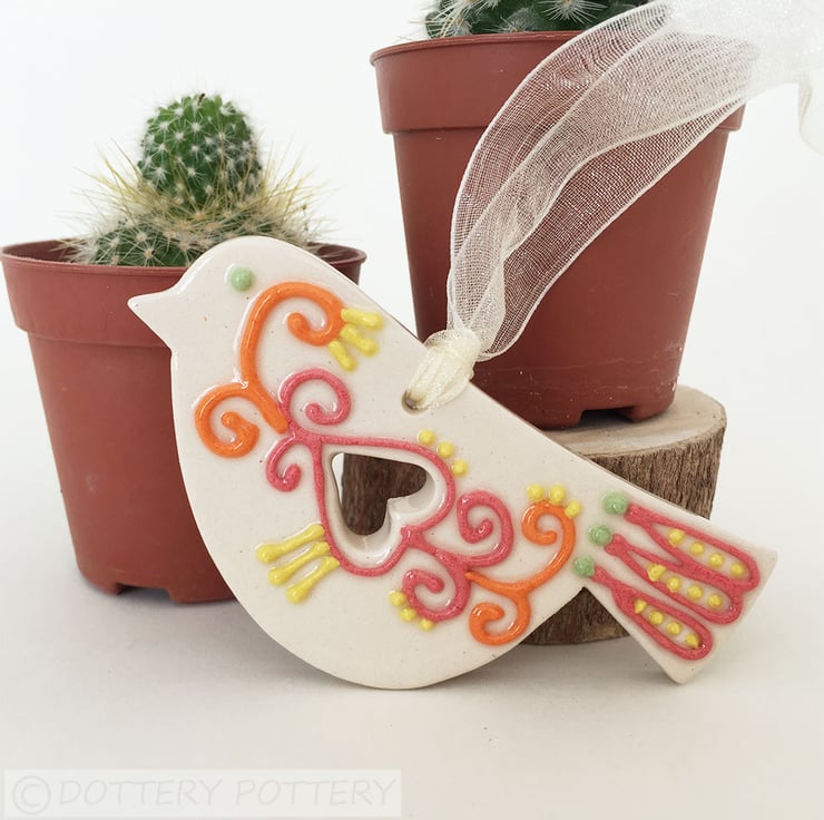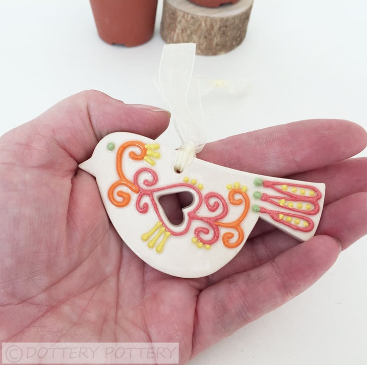 This cute little pottery bird has been hand-cut from a template that I designed myself.