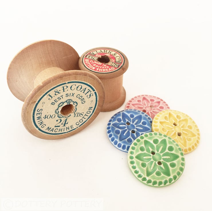 This set of four buttons are made from white earthenware clay, embossed and glazed to 1100 degrees, so nice and strong. Button size 28mm across and 3mm deep They can be handwashed or machine washed on a low temperature Perfect for all sorts of arts and craft projects.