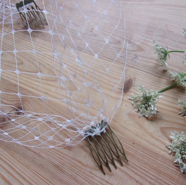 The ends of the veil are hand sewn onto two small either antique brass or silver metal combs, which can be positioned at various points on the head.