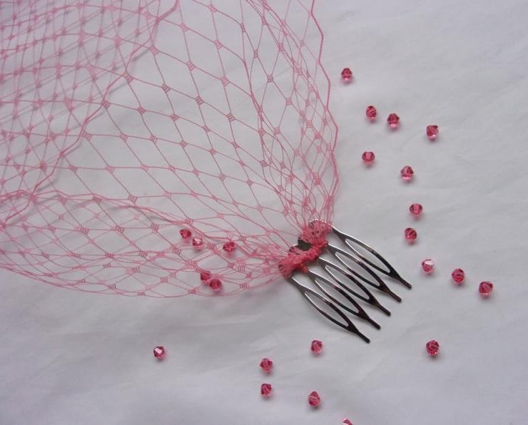 This is a beautiful bandeau birdcage style veil made from delicate soft coral classic veiling.