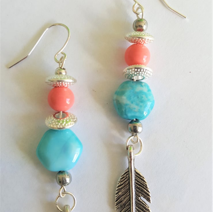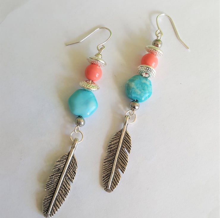 I have created them from genuine turquoise hexagon and 6mm coral beads, with silver tone rondelle spacers. A matching feather charm completes the earrings and gives extra swingability.
