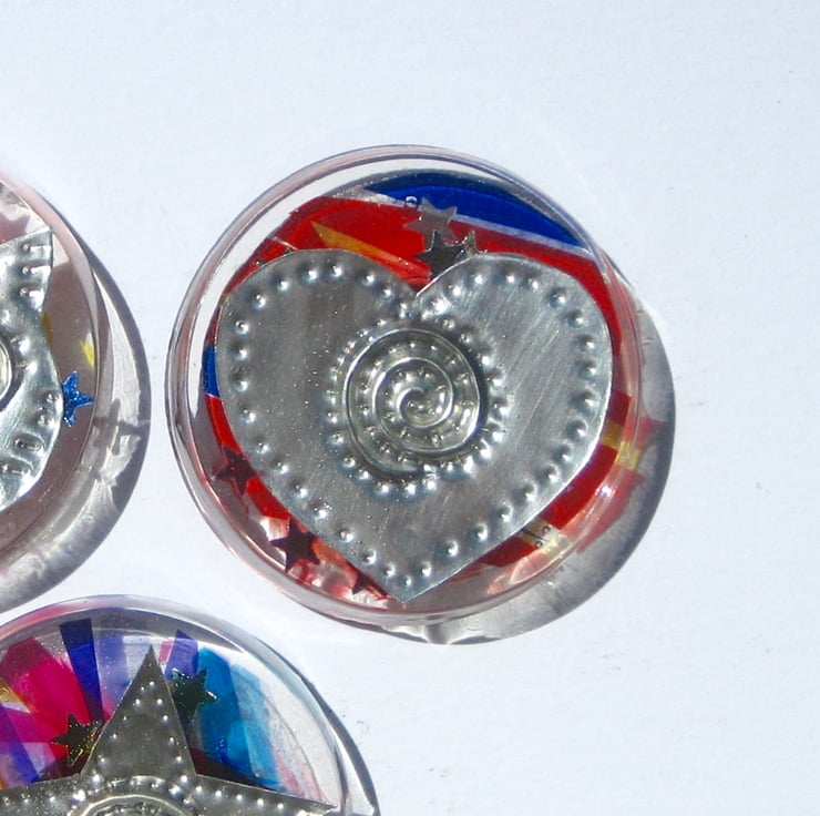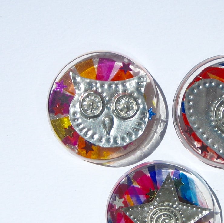 Three random bright handmade fridge magnets! What connects an owl, a heart and a star, (apart from them all being made from hand embossed pewter shapes and resins)? Well, owls and stars come out at night and some people love owls and stars.....