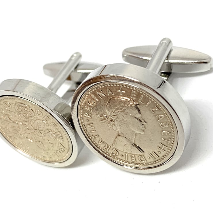 Genuine 1967 Circulated 58th year old Sixpence cleaned and polished then inset in Silver Plated French cufflink backs creating a unique look and feel