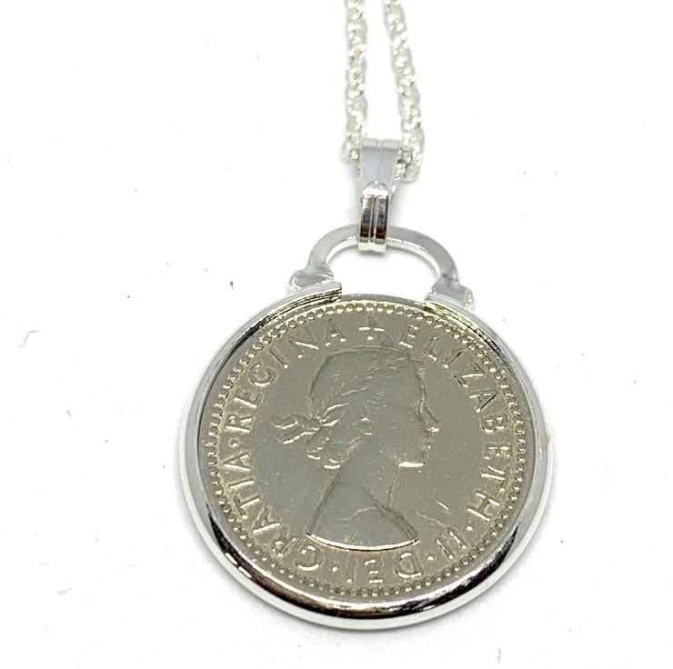 A genuine circulated 1960 hand polished sixpence attached to a silver plated pendant mount