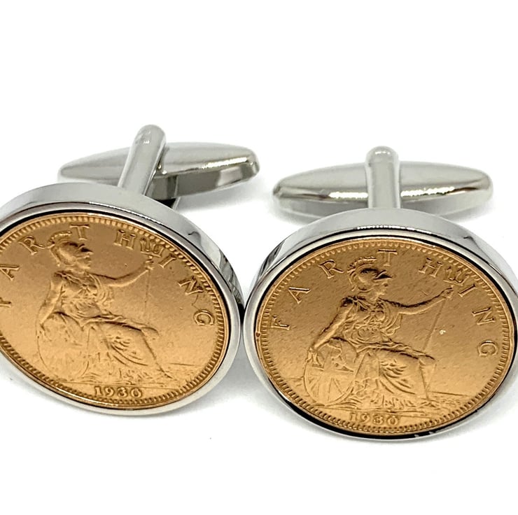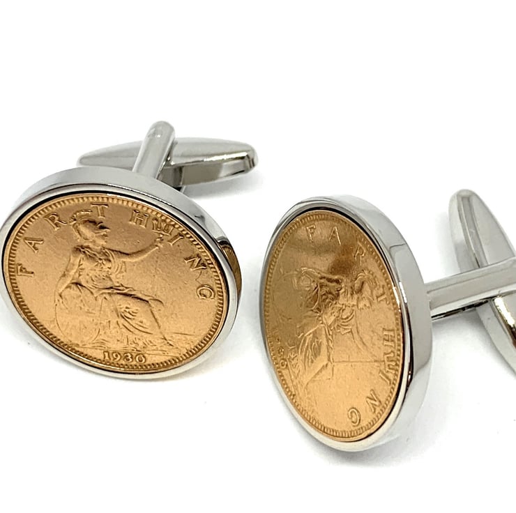 A Genuine pair of 95th Circulated Farthing coins cleaned and polished then inset into silver plated cufflinks.