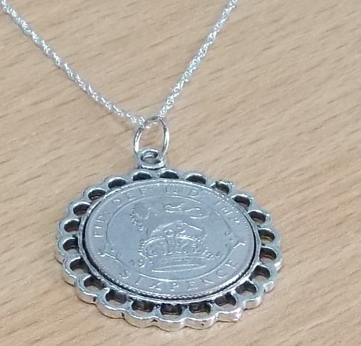Genuine Circulated Sixpence Mounted on a Tibetan Silver mount with a 18 inch Sterling silver chain 1922 coin