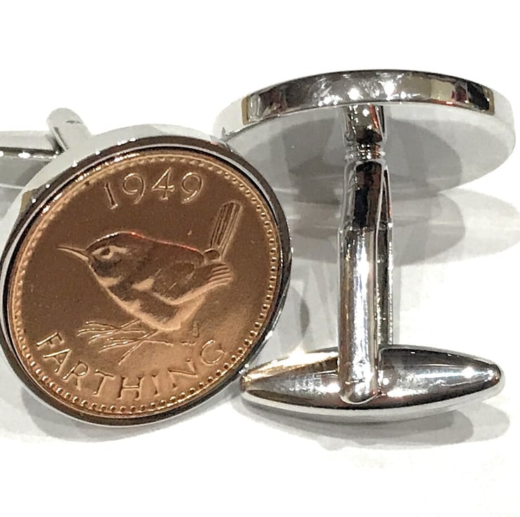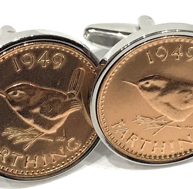 A Genuine pair of 1953 Circulated Farthing coins cleaned and polished then inset into silver plated cufflinks.