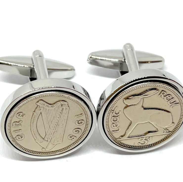 Genuine Irish 3d threepence coin cufflinks mounted in Silver plated cufflink backs.