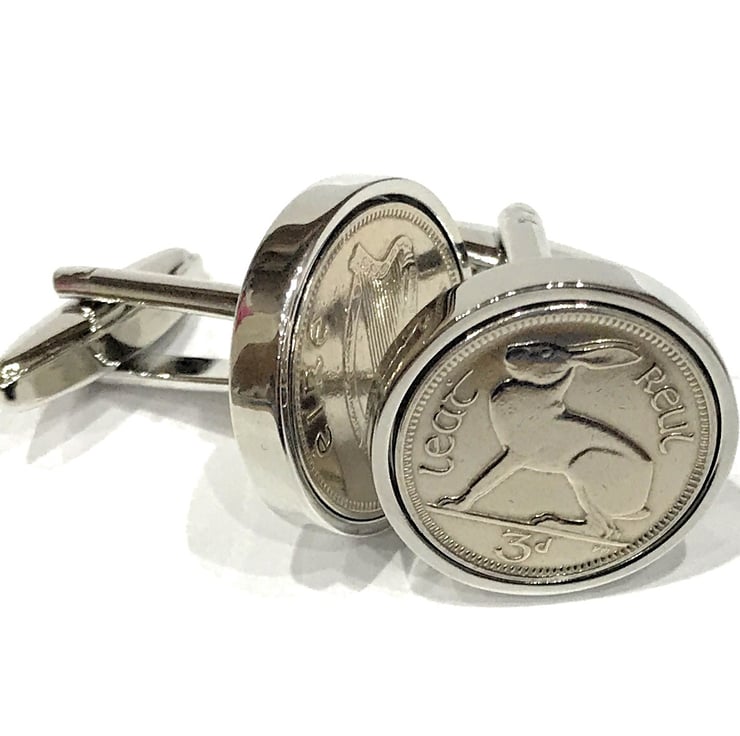 Genuine Irish 3d threepence coin cufflinks mounted in Silver plated cufflink backs.