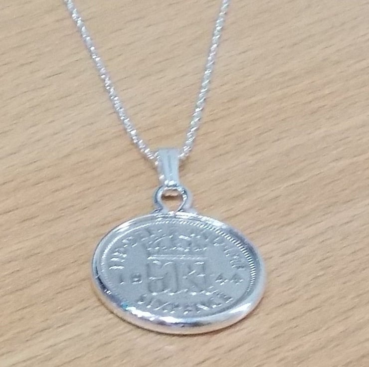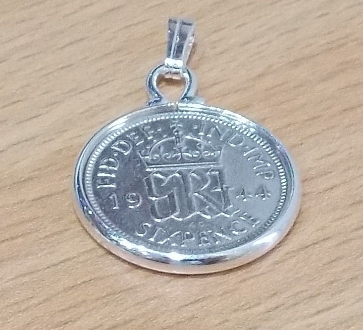 A genuine circulated 1941 hand polished sixpence attached to a silver plated pendant mount