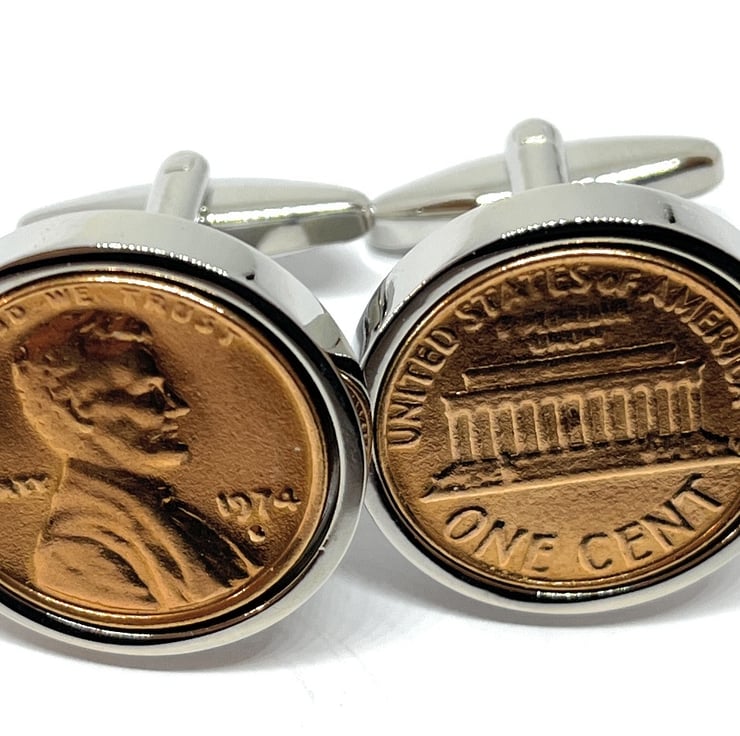 Original coins from 1974 have been cleaned and polished and inset into Silver plated french cufflink backs.