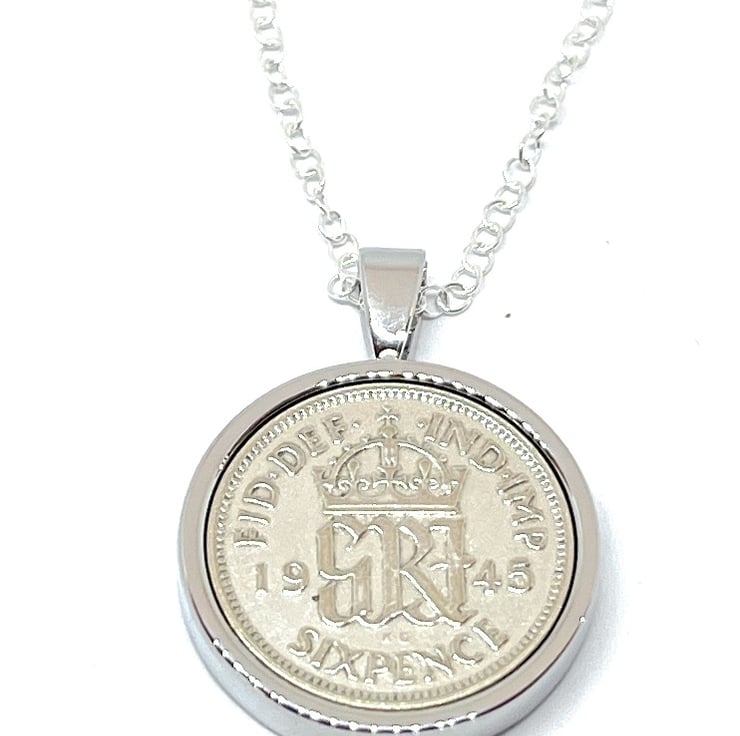 1945 80th Birthday Anniversary Sixpence coin in a Silver Plated Pendant mount
