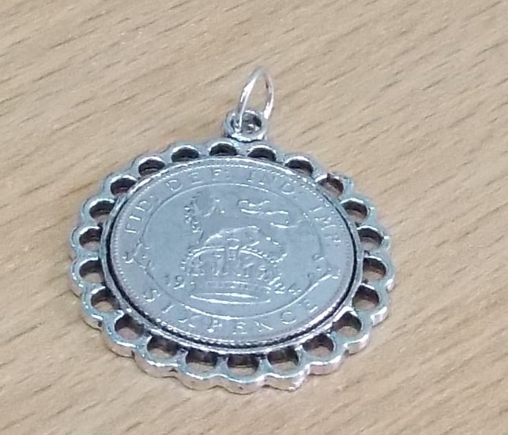 Genuine Circulated Sixpence Mounted on a Tibetan Silver mount with a 18 inch Sterling silver chain 1924 coin