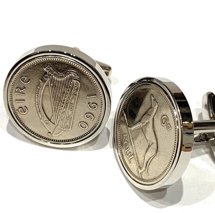 Genuine 1960 Circulated 65th year old Irish Sixpence cleaned and polished then inset in Silver Plated French cufflink backs creating a unique look and feel