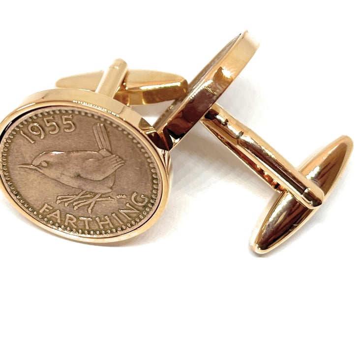 A Genuine pair of 1955 Circulated Farthing coins cleaned and polished then inset into silver plated cufflinks.