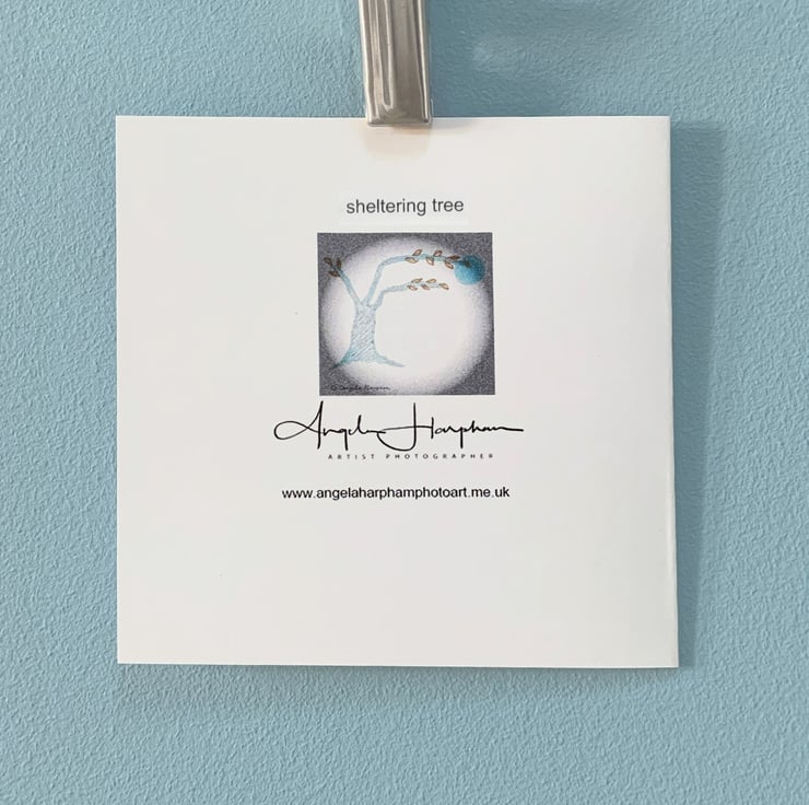 Square blank art card with one of my own digital iPad graphic drawings of a tree, titled 'sheltering tree'. It is one of a series, this one with orange leaves is called autumn, it is blank inside, has an envelope and is cello wrapped