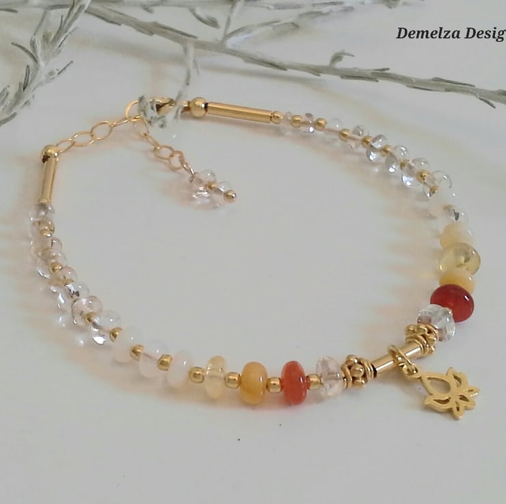 A very attractive dainty bracelet designed and hand crafted using genuine Mexican Fire Opals and rare Imperial Topaz. Imperial topaz is totally natural without any treatments and the sparkle coming from them is exceptional in any light source. The Mexican fire opals are the shades found from mexico with a good natural internal opal essence and amber colours. Both genuine gemstone types are rondelle cut complimented with all gold vermeil components. For the main construction professional gold coloured coated jewellers wire has been used for added strength and lasting durability, finished off with a gold vermeil clasp and extender chain. In the centre is a sliding gold vermeil lotus flower. At the end of the extender chain are two imperial topaz to professionally finish the bracelet off.