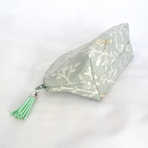 Handmade in a mint green cotton with a bird motif, the bag is lined in a sea green cotton print. The zip closure comes complete with a lovely faux velvet tassel trim.The wide and shallow styling of this spacious makeup bag, offers greater visibility and accessibility to your cosmetics. Made using a strong but lightweight foam interlining, this cosmetics bag will stand by itself.