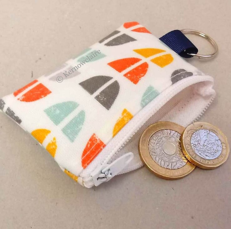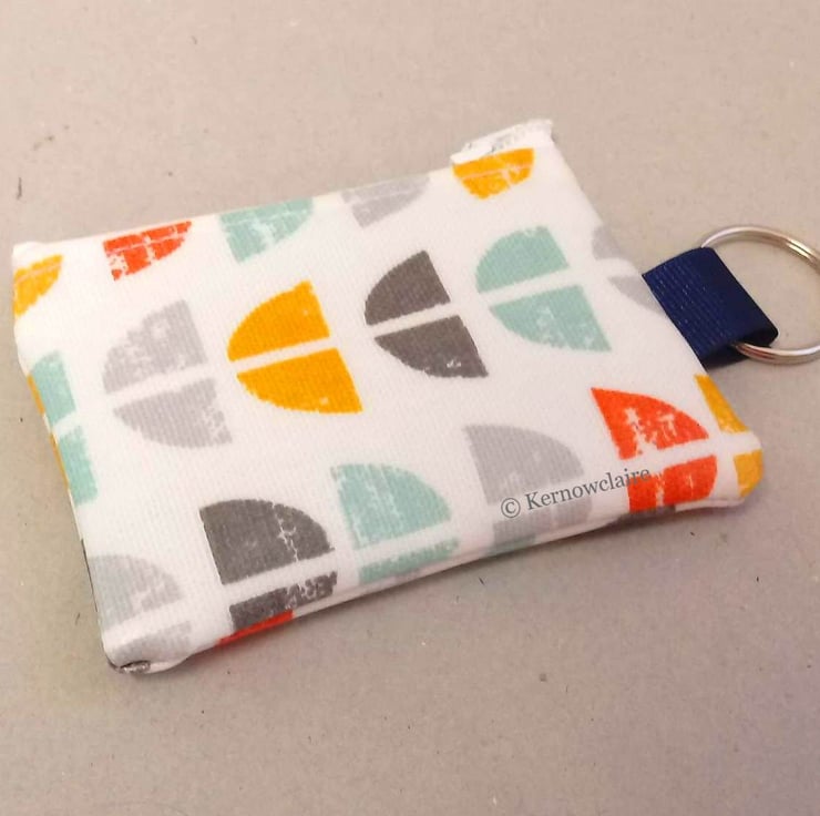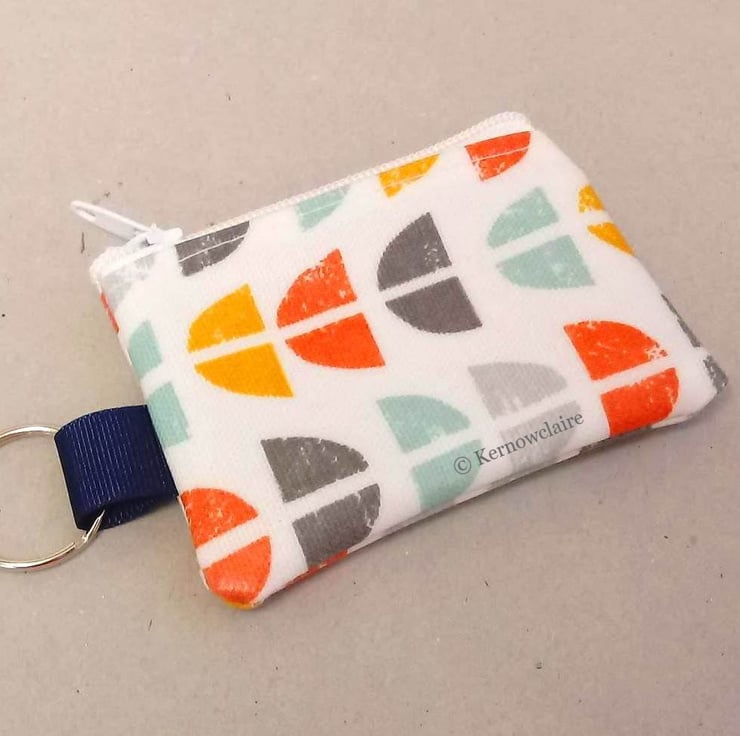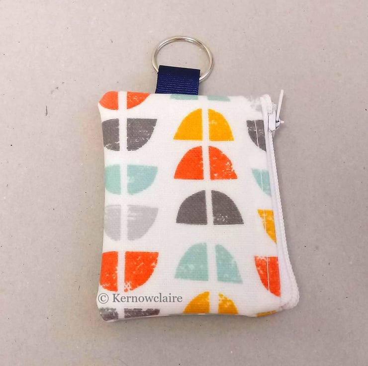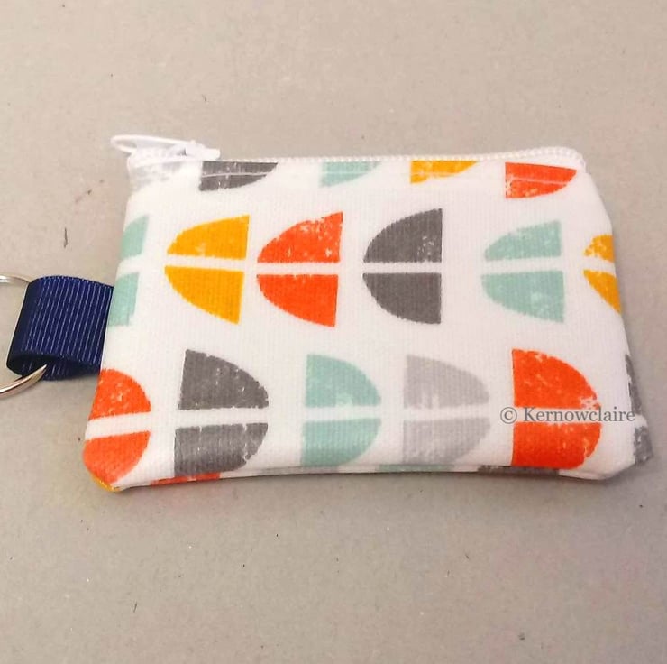 This is a lovely mini coin purse key ring, handmade in oilcloth. It is white with an orange, aqua and grey pattern. It has a white zip and the inner seams are double stitched for added strength. Perfect for coins, stamps or a couple of doggie bags. It will hang nicely from your keys.