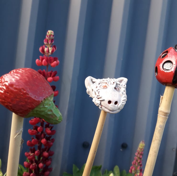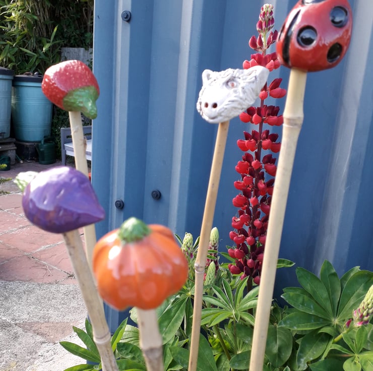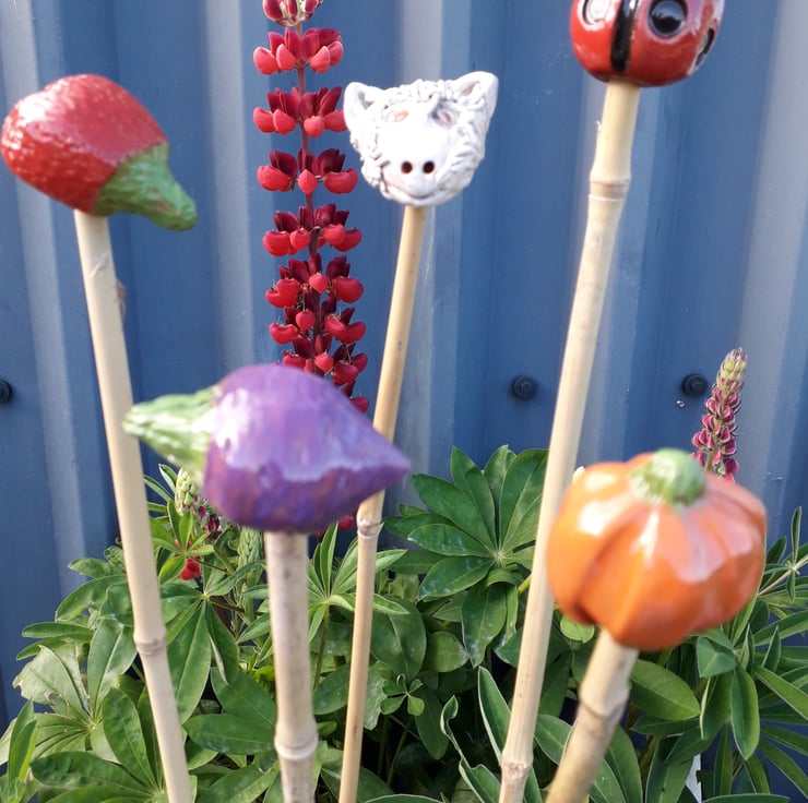 Cane Tops for your garden. Made from red earthenware clay, all glazed to suit the subject! Last for years and years in all weathers in your garden. These are the Garden Vegetable Variety Orange Pumpkin, Beetroot and Red Strawberry Plus a Ladybird and Sheep. I use a variety of different bamboo canes to give a variety of hole sizes to fit bamboo canes. Sold as a set of 5.