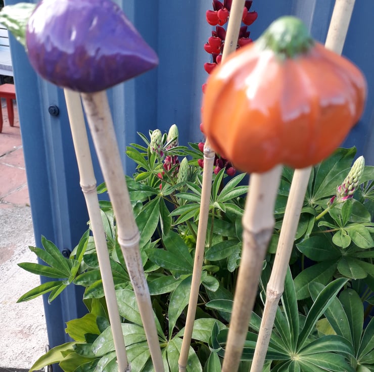 In 2003, as a keen gardener I wanted some cane tops, but they were all very boring and plastic. Working in my pottery one day messing around with a bit of left over clay, I started making a toadstool, my husband came in and asked what I was making and I said not sure! He came back with a bamboo cane and said "Cane Tops" - boom excellent idea. I have sold them at various garden shows in the UK. £2.50 each or 5 for £10.00. Love them