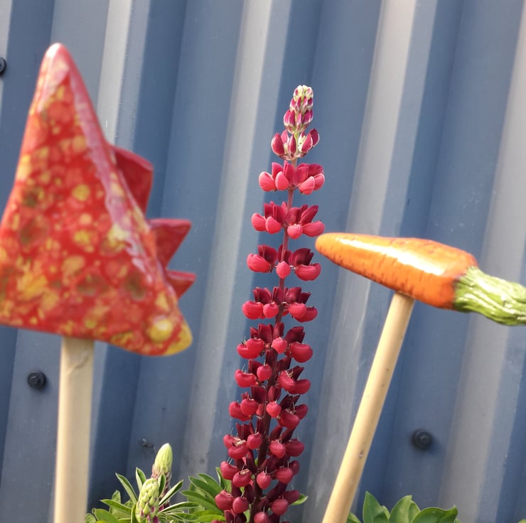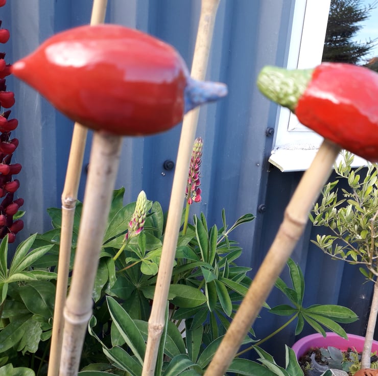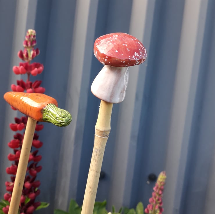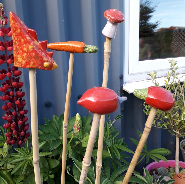 Cane Tops for your garden. Made from red earthenware clay, all glazed to suit the subject! Last for years and years in all weathers in your garden. These are the Garden Vegetable Variety Red & White Mushroom, Red Pepper, Orange Carrot, Red Radish and Red Speckled Chicken. I use a variety of different bamboo canes to give a variety of hole sizes to fit bamboo canes. Sold as a set of 5.