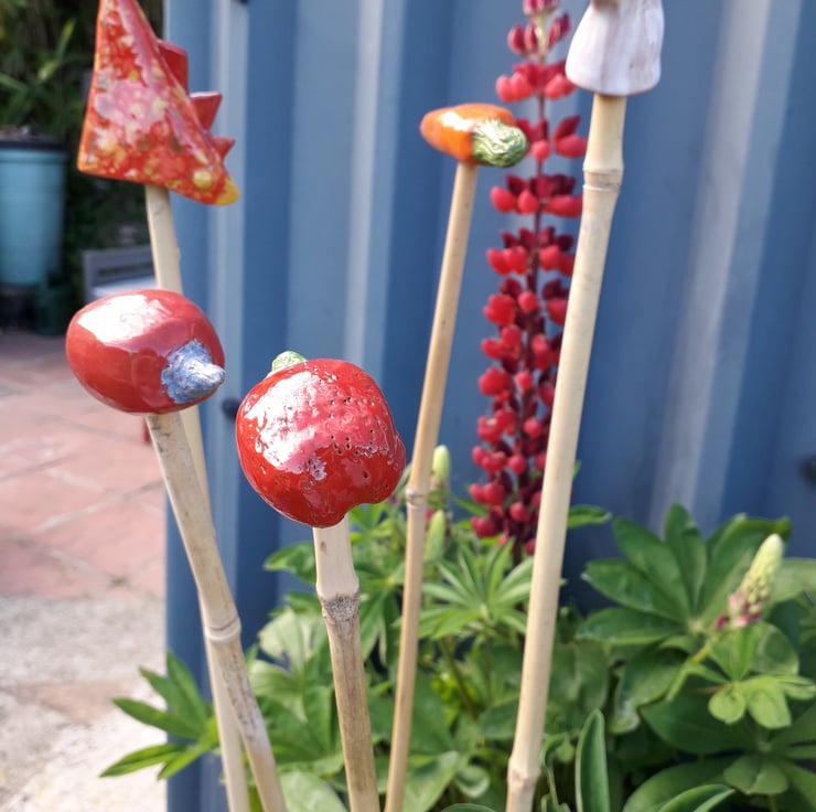 In 2003, as a keen gardener I wanted some cane tops, but they were all very boring and plastic. Working in my pottery one day messing around with a bit of left over clay, I started making a toadstool, my husband came in and asked what I was making and I said not sure! He came back with a bamboo cane and said "Cane Tops" - boom excellent idea. I have sold them at various garden shows in the UK. £2.50 each or 5 for £10.00. Love them