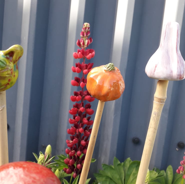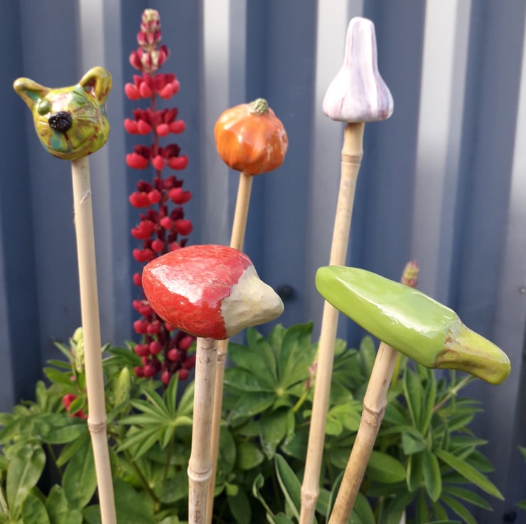 Cane Tops for your garden. Made from red earthenware clay, all glazed to suit the subject! Last for years and years in all weathers in your garden. These are the Garden Vegetable Variety Orange Pumpkin, White Garlic, Green Chilli Pepper, Red Strawberry and a Yellow Speckled Cat. I use a variety of different bamboo canes to give a variety of hole sizes to fit bamboo canes. Sold as a set of 5.