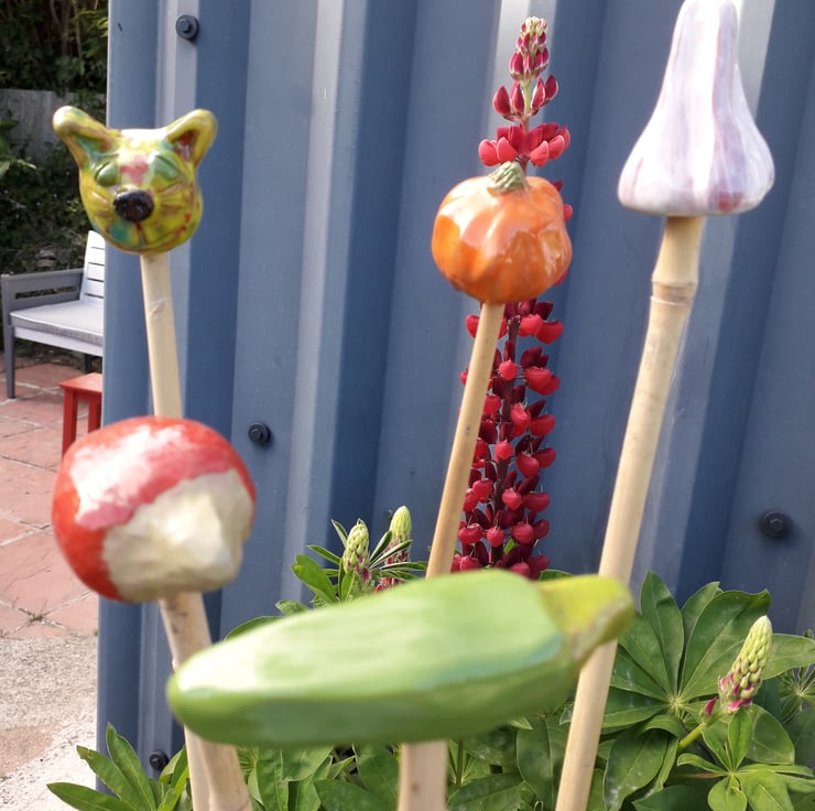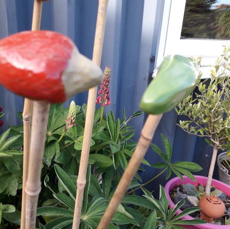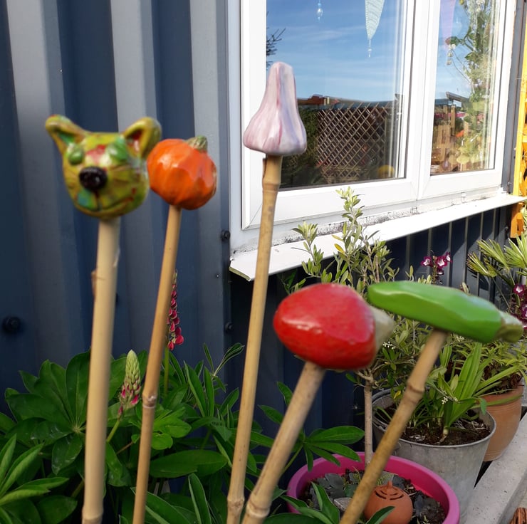 In 2003, as a keen gardener I wanted some cane tops, but they were all very boring and plastic. Working in my pottery one day messing around with a bit of left over clay, I started making a toadstool, my husband came in and asked what I was making and I said not sure! He came back with a bamboo cane and said "Cane Tops" - boom excellent idea. I have sold them at various garden shows in the UK. £2.50 each or 5 for £10.00. Love them.